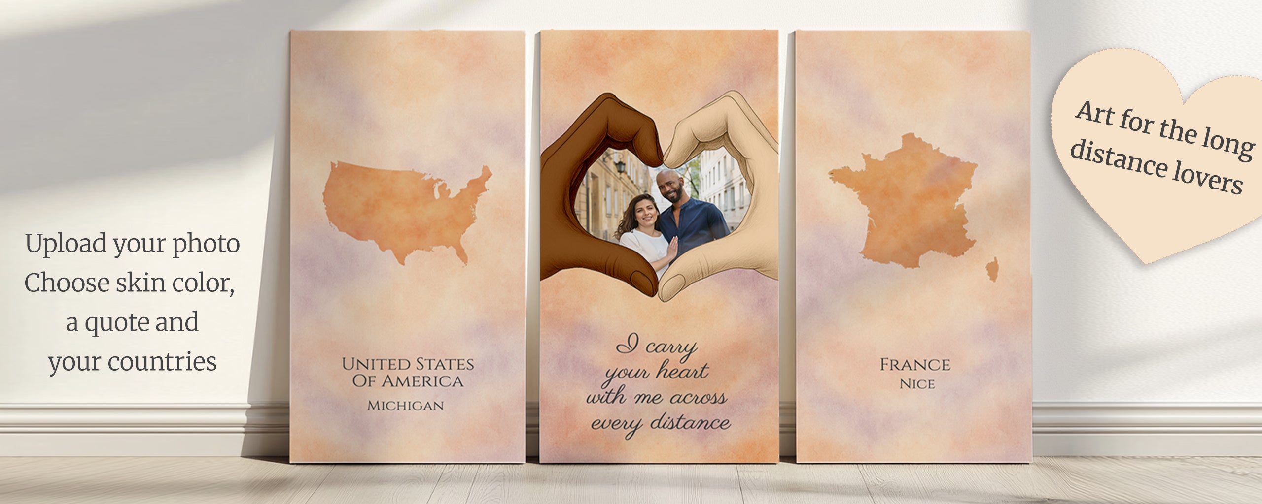 This three-piece canvas collection tells your complete love story - the places you each call home and the unbreakable bond connecting you across any distance. Perfect for military couples, international relationships, or anyone whose heart lives in two places. A daily reminder that love knows no boundaries.
